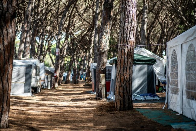 Tende da campeggio tra alti alberi in pineta.